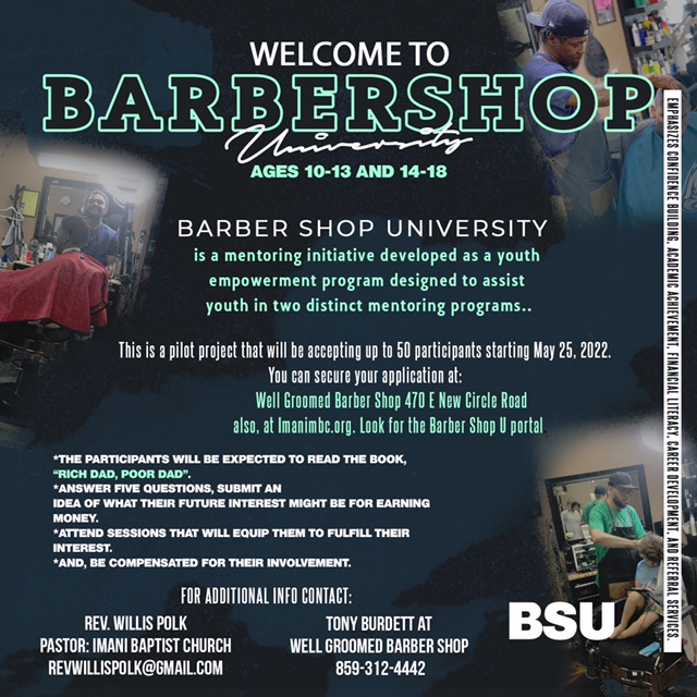 Youth are mentored by barbers on community resources available to them in family-centered barbershops to facilitate trust between youth and Barbershop U mentors. Mentors provide aid to youth in the form of active listening, personal hygiene, financial literacy, academic performance, interpersonal relationships, and self enhancement (sports, music, arts, industry, career development). 100% engagement by Barbershop U mentors is measured against barber, barbershop, and youth recruitment numbers. In addition, each Barbershop U mentor must attend an annual mentoring education session. This goal is worthwhile because Barbershop U focuses on serving communities in ways that are relevant and differentiate Barbershop U programming to that of other programs.